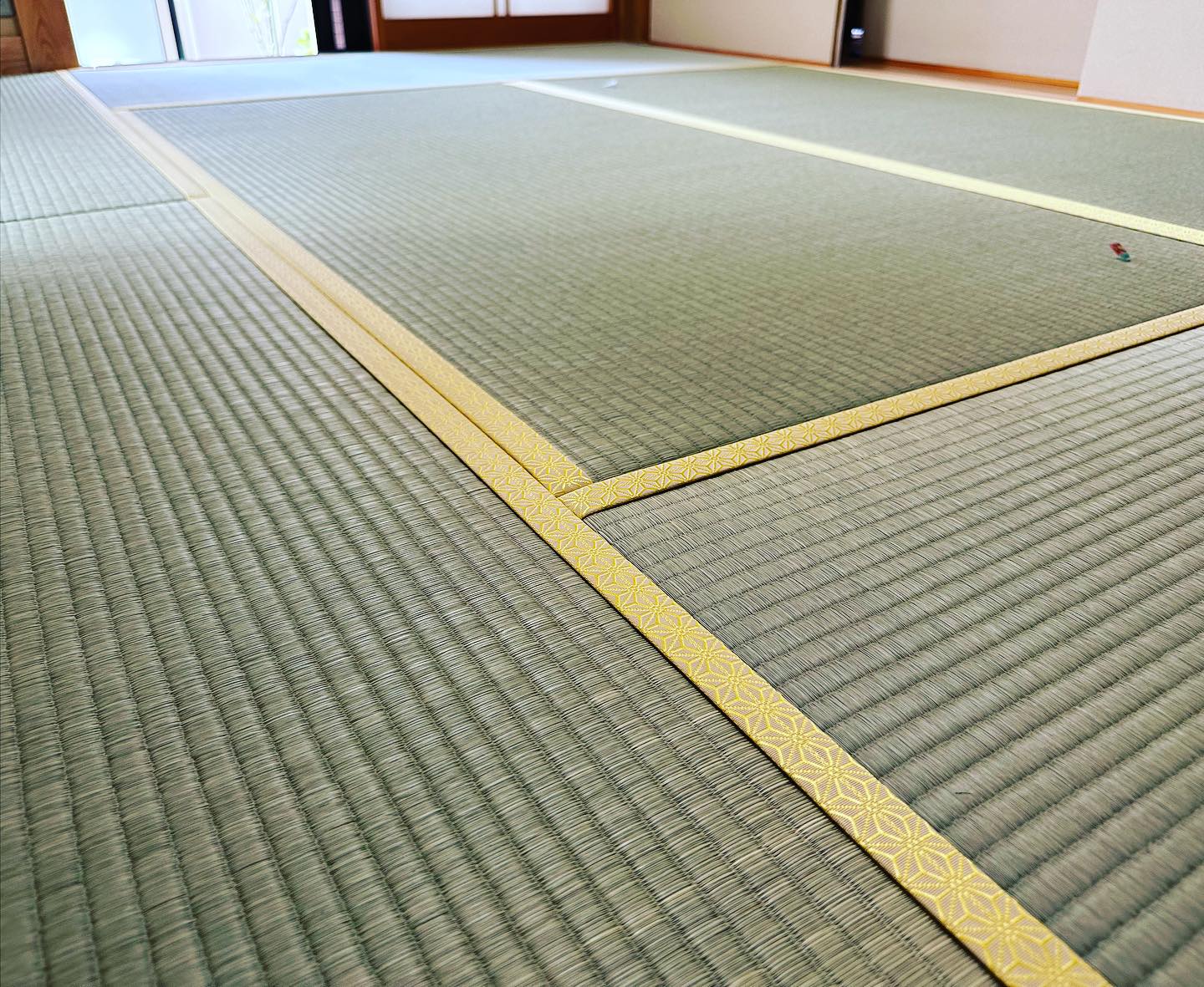 緑の畳に黄金色の麻の葉模様の畳ヘリで、風水的に金運アップ、健やかな健康など良いイメージがあります お部屋も華やかで、明るくなりました。