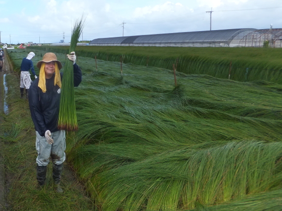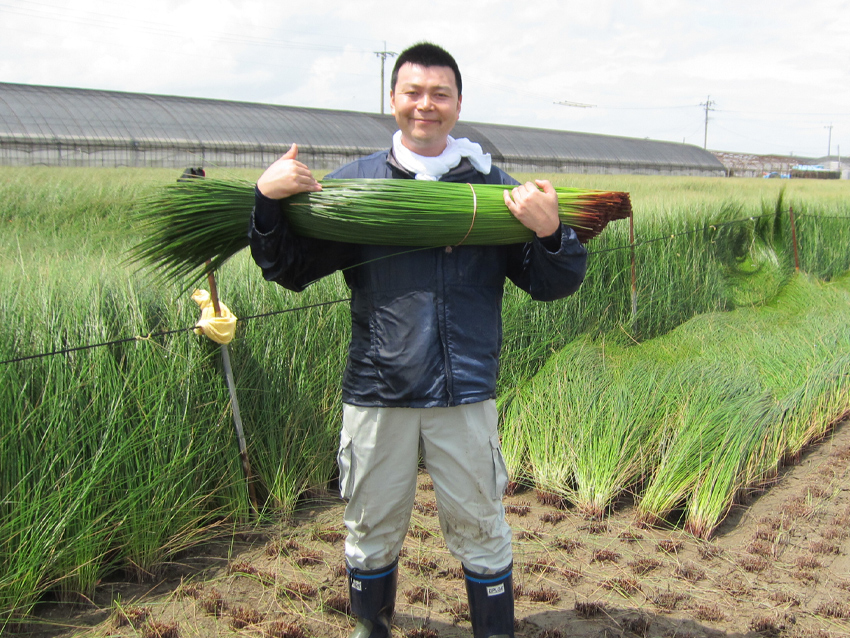 収穫・乾燥・選別の各工程は、書面のやり取りだけに頼らず現地で実物を確認します。熊本の生産者を訪ね、圃場の管理状況(雑草・病害の出方、施肥や水管理の履歴)、草丈・太さ・節の状態、色の“のり”とむらを実際に手に取りチェック。刈り取り後は泥染めの均一性、乾燥後の含水感、曲がり・折れ・キズの有無、選別基準の運用を確認し、当店の基準と目視・触感での合格ラインをすり合わせます。